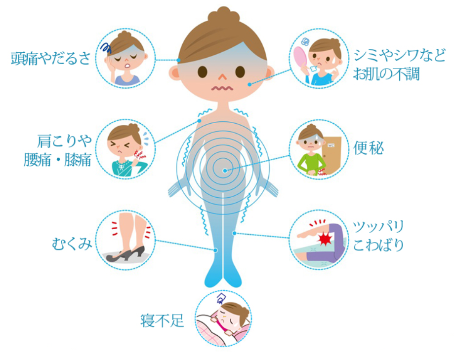 頭痛、肩こり、腰痛、腹痛、生理不順、体のだるさ、不眠、便秘、お肌の不調、むくみなど、
